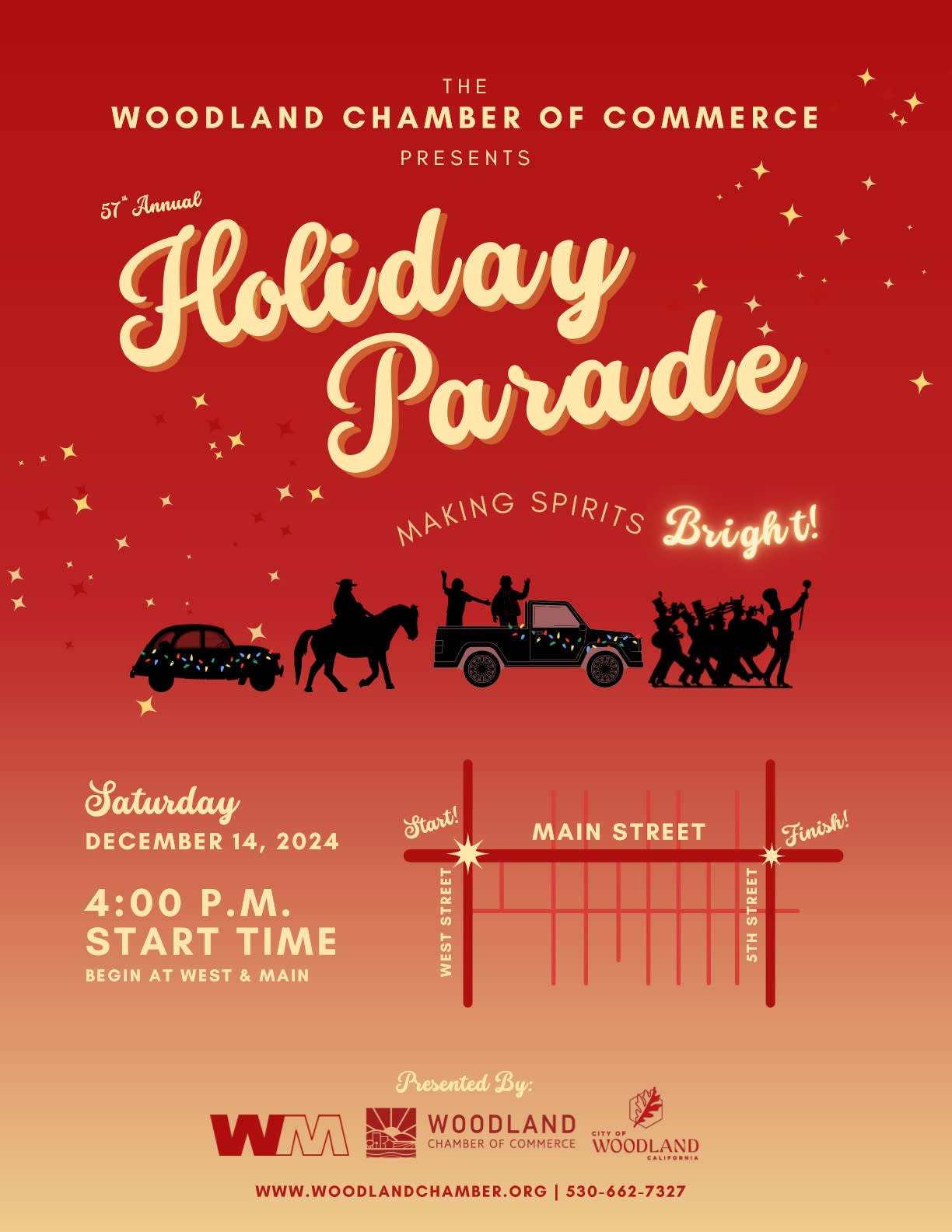 The Woodland Chamber of Commerce proudly announces the long-awaited return of the 57th annual Holiday Parade! The parade will ride down Main Street on December 14th this year, with them of "Making Spirits Bright." We want to thank the City of Woodland and Waste Management of Woodland for sponsoring this event.