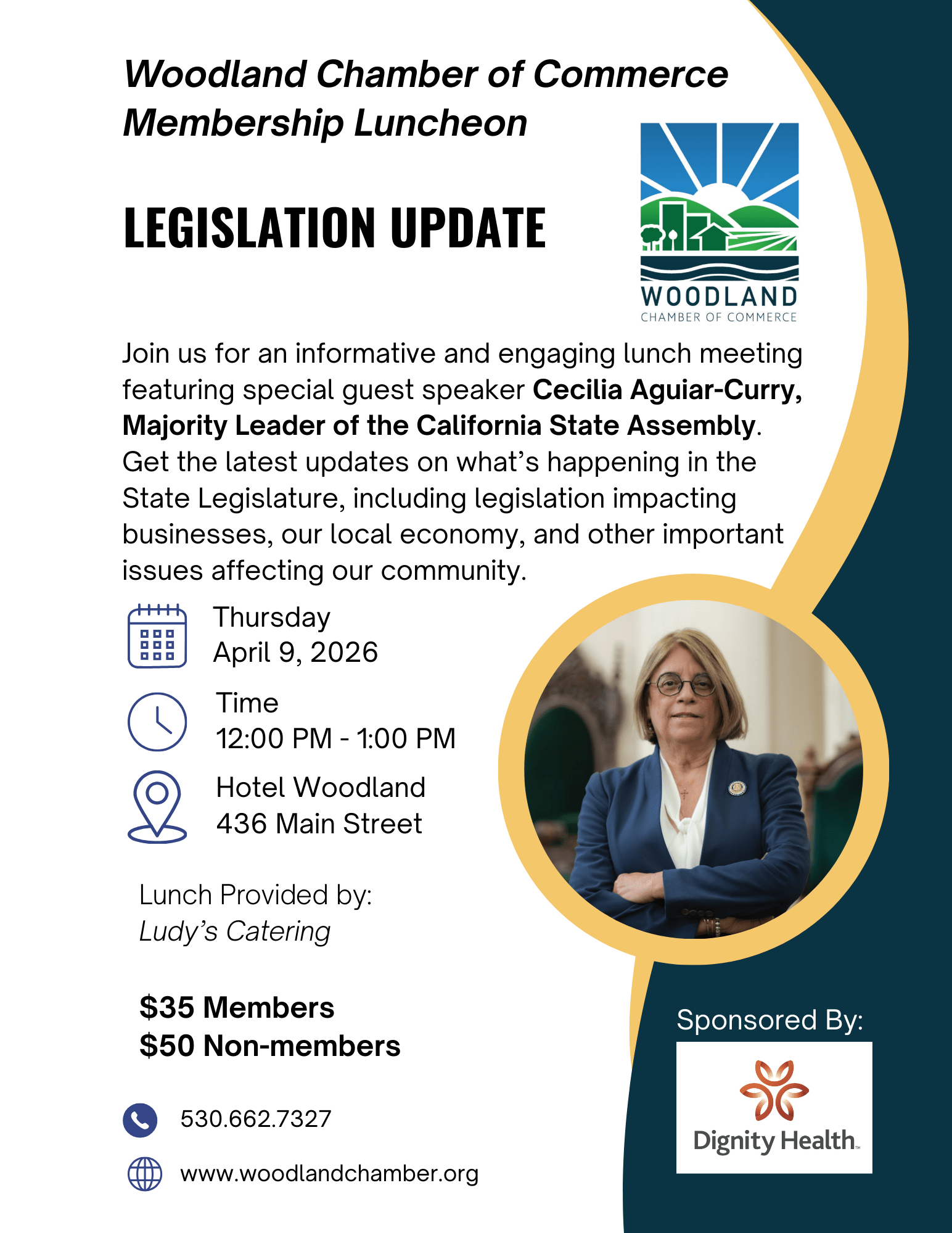 Join us for an informative and engaging lunch meeting featuring special guest speaker Cecilia Aguiar-Curry, Majority Leader of the California State Assembly. Get the latest updates on what’s happening in the State Legislature, including legislation impacting businesses, our local economy, and other important issues affecting our community.
