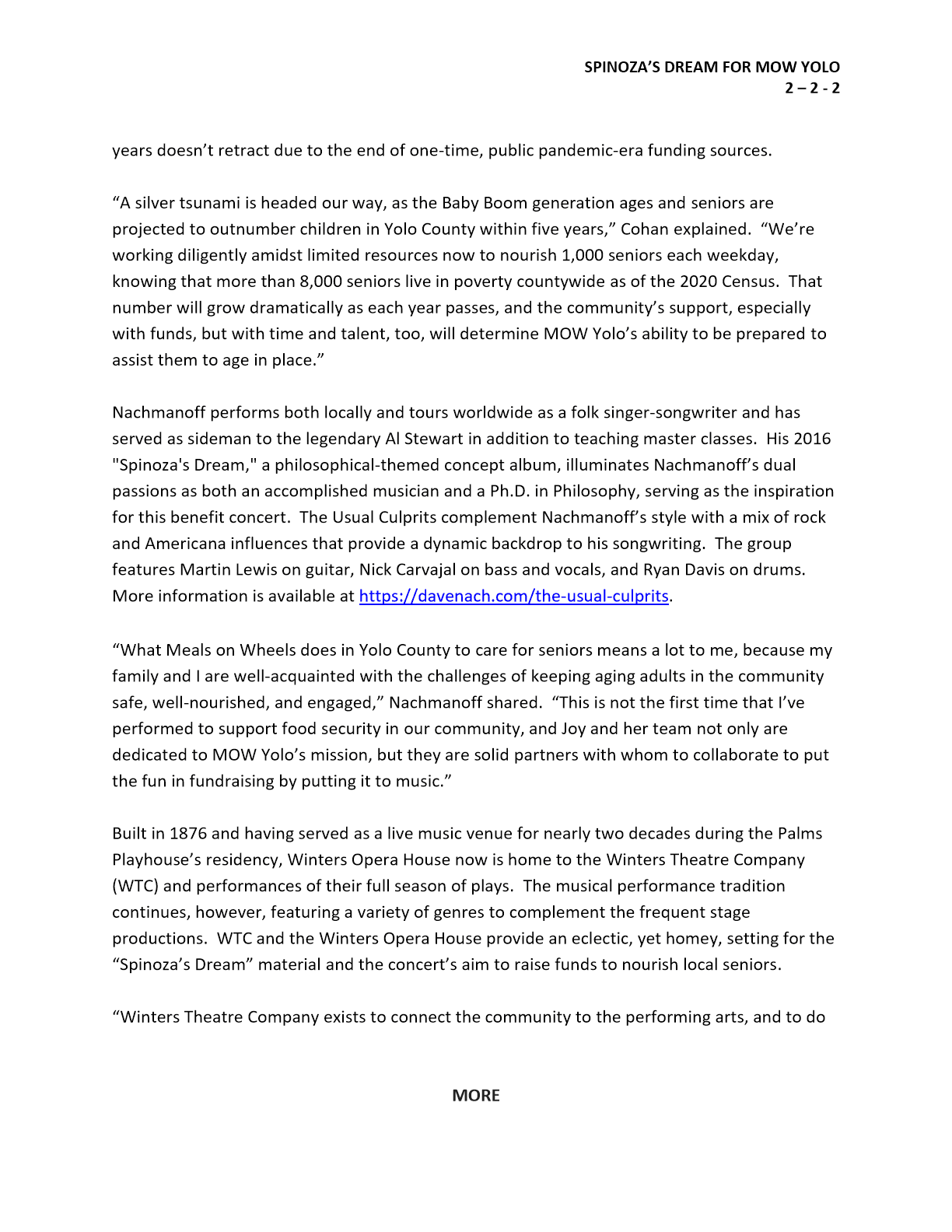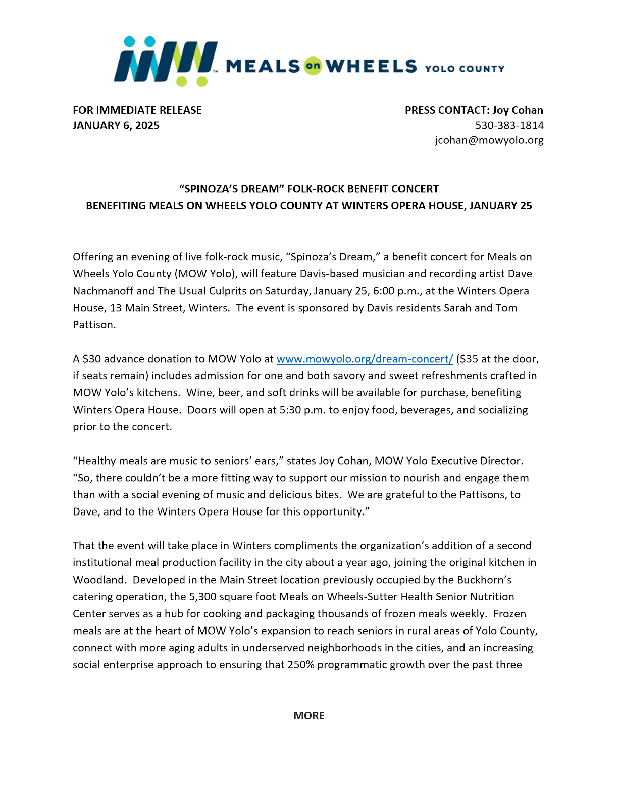 Join us for an evening of music, refreshments and fun on Saturday, January 25, 2025 at the Winters Opera House! This concert is sponsored by Sarah and Tom Pattison with ALL proceeds going to Meals on Wheels Yolo County.