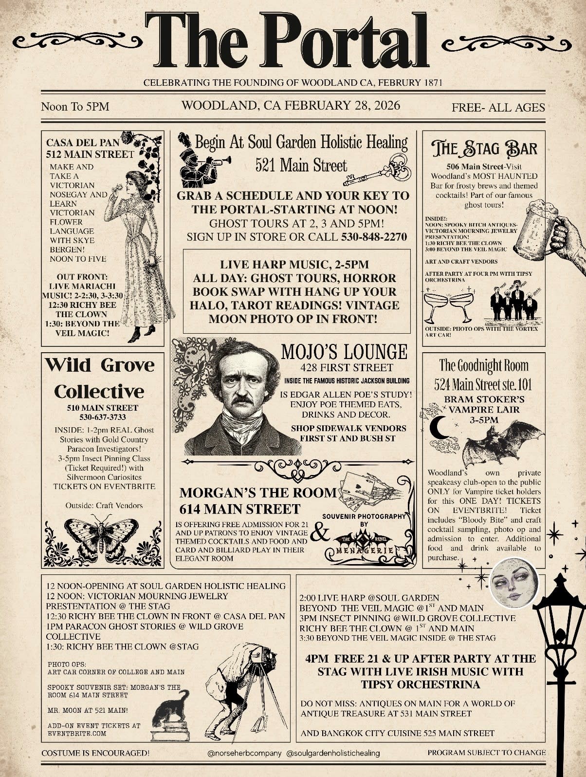 Step through the Portal.. where time is an illusion! Travel back to the Victorian and gold rush age of Main Street Woodland California when entrepreneurs ruled and gold won the west! The Portal Marketplace and Extravaganza showcases and highlights some amazing small businesses. Both our unique Main Street shops and restaurants as well as handmade sidewalk vendors! The Portal has four distinct and special components for you to enjoy: 1: Handmade vendors. Main Street from college to first will feature handmade small businesses. Shop and meet your local artisans and makers! Some will be crafting live in their booth for you to see! 2. An exciting GHOST tour (additional fee for this part) of several buildings and the area. This is a walking tour of the outside of each building, sign ups for the tour are at Noon at Soul Garden Holistic Healing 521 Main Street. 3. Live entertainment! We have several musicians playing historic music from a real Barbershop Quartet to a traditional Irish band! Something for everyone! We also have professional clown Richy Bee performing for the kids and adults to enjoy!! Many performances throughout the day to enjoy and then, after party with Tipsy Orchestrina with their very vintage jukebox versions of favorite hits as well as lively Irish tunes! Starts at five at the Stag Bar! 4. Spiritual practitioners: you can sign up for a tarot reading, at Soul Garden Holistic Healing. Costs vary for these services and sign ups are limited. We recommend signing up at event open at noon! Other EXCITING OFFERINGS FOR 2026: 1. Goodnight Room speakeasy is hosting a Bram Stoker themed Vampire meet up! A separate paid ticket is required for this add on. 2. Insect Pinning! Sign up to learn the Victorian art of insect pinning with Silvermoon Curiosities. The class will be held at Wildgrove Collective and an additional fee must be paid via Eventbrite to participate. 3. Gold Country Paranormal Investigators presentation. Drop in to Wild Grove collective for these Northern California real life ghost stories. Consult Eventbrite for full schedule. 4. The Vortex- a super unique art car with a steampunk flair-will be available in front of the Stag Bar for photo ops! 5. Horror Book Swap and Meet Up! Taking place at Casa Del Pan! Hosted by Hang Up Your Halo! Bring a book to leave, take a new one home! Cost to attend is FREE TO THE PUBLIC and all ages are welcome! We ENCOURAGE Victorian era dress, as it will make our event MORE immersive! (Think the Titanic film, or Disney Haunted Mansion or the Dickens’s Fair for inspiration.) The event will begin at noon, a hostess located at Soul Garden (521 Main Street) will greet you and give you a map and schedule. You can show up at any time during the day and find fun and entertainment!!! Absolutely something for everyone! Turn back time and experience the history, the fun and the spirit that lives on in historic downtown Woodland!